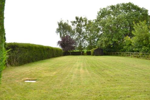 Large garden area laid to lawn sheltered by surrounding hedges, store